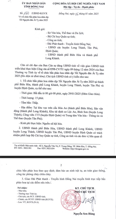 Ngày 06/1, Ủy ban nhân dân tỉnh Đồng Nai chính thức ban hành văn bản 160/UBND-KGVX về việc tổ chức bắn pháo hoa nhân dịp Tết Nguyên đán Ất Tỵ 2025.