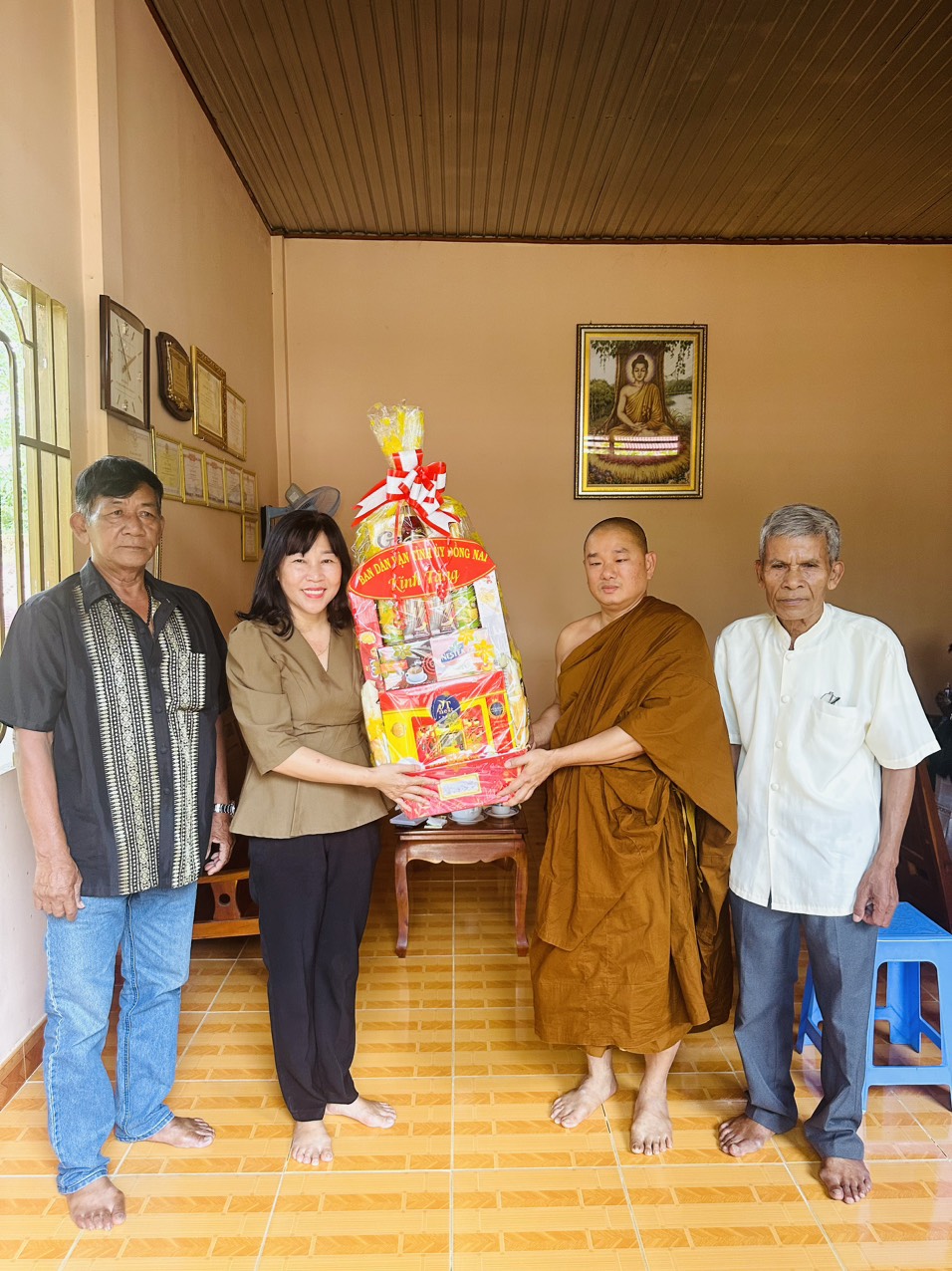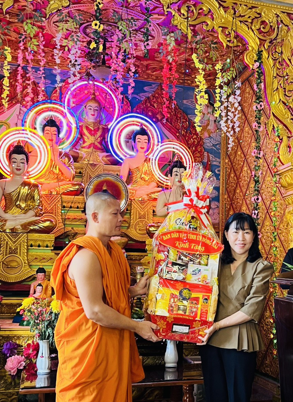 Đồng chí Nguyễn Thị Vẹn – Phó Trưởng ban Dân vận Tỉnh ủy tặng quà, chúc tết đại đức Thạch Sa Huynh, trụ trì chùa Hoa Sơn, phường Phú Bình, thành phố Long Khánh