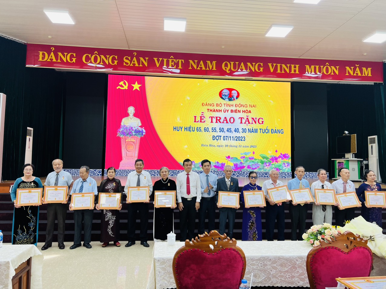 Chiều ngày 10/11/2023, Ban Thường vụ Thành ủy Biên Hòa tổ chức Lễ trao tặng Huy hiệu 30 đến 65 năm tuổi Đảng đợt (07/11) năm 2023 cho các đồng chí đảng viên là cán bộ hưu trí đang sinh hoạt tại các chi bộ, đảng bộ trực thuộc Thành ủy Biên Hòa.