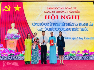Đảng ủy phường Trấn Biên tiếp nhận và thành lập 11 tổ chức cơ sở Đảng trực thuộc 29/01/2026 18:58:29 12 Sáng 29-1, Đảng ủy phường Trấn Biên tổ chức Hội nghị công bố quyết định tiếp nhận và thành lập 11 tổ chức cơ sở đảng trực thuộc Đảng bộ phường Trấn Biên. Tham dự hội nghị có Phó Bí thư chuyên trách Đảng ủy UBND tỉnh Đồng Nai Nguyễn Văn Dũng.