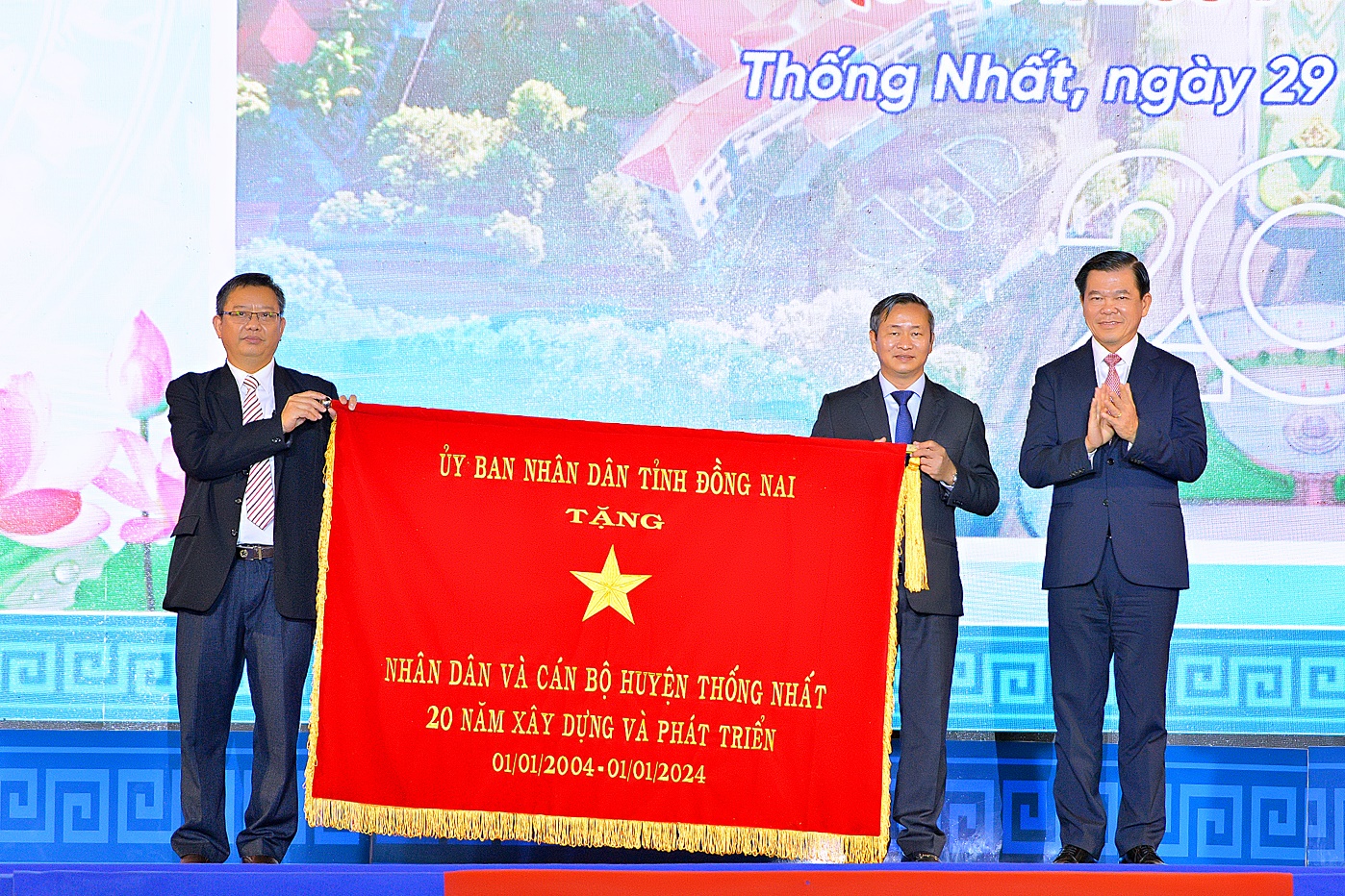 Thay mặt lãnh đạo tỉnh, đồng chí Nguyễn Hồng Lĩnh - Ủy viên Ban Chấp hành Trung ương Đảng, Bí thư Tỉnh ủy và đồng chí Võ Tấn Đức - Ủy viên Ban TVTU, Chủ tịch UBND tỉnh đã trao bức trướng và tặng hoa chúc mừng Đảng bộ, chính quyền và Nhân dân huyện Thống Nhất.