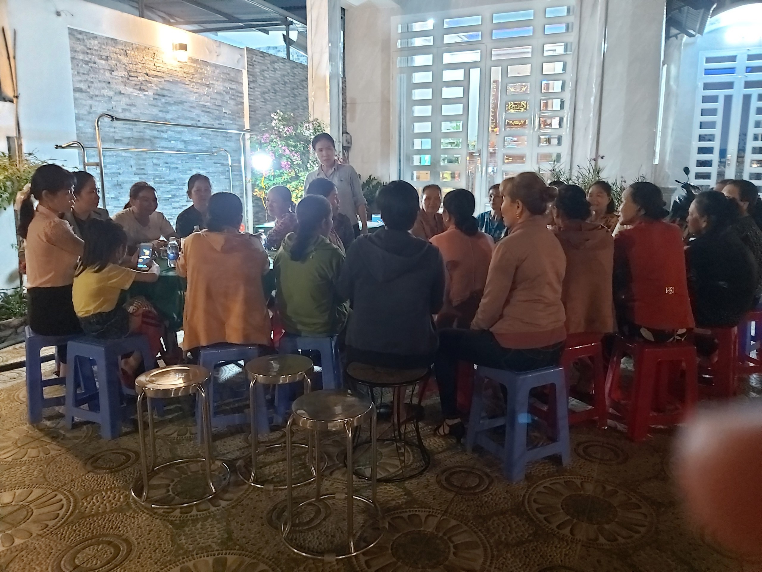 Cô Xuân (đứng giữa) trong một buổi sinh hoạt của Chi hội phụ nữ ấp Hưng Nghĩa, xã Hưng Lộc