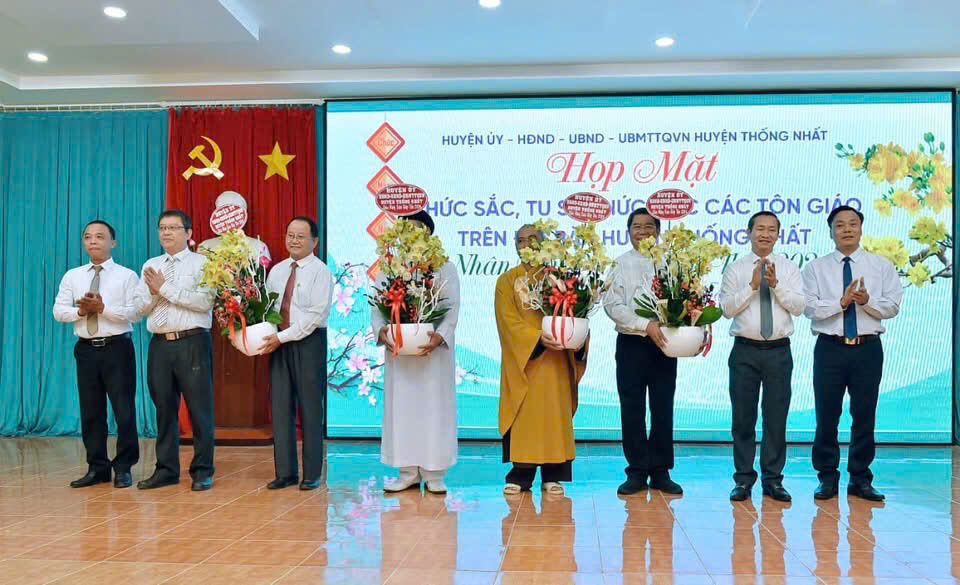 Lãnh đạo huyện Thống Nhất tặng hoa chúc mừng các vị chức sắc, tu sĩ, chức việc các tôn giáo trên địa bàn huyện Thống Nhất tại buổi họp mặt chức sắc, tu sĩ, chức việc các tôn giáo năm 2024