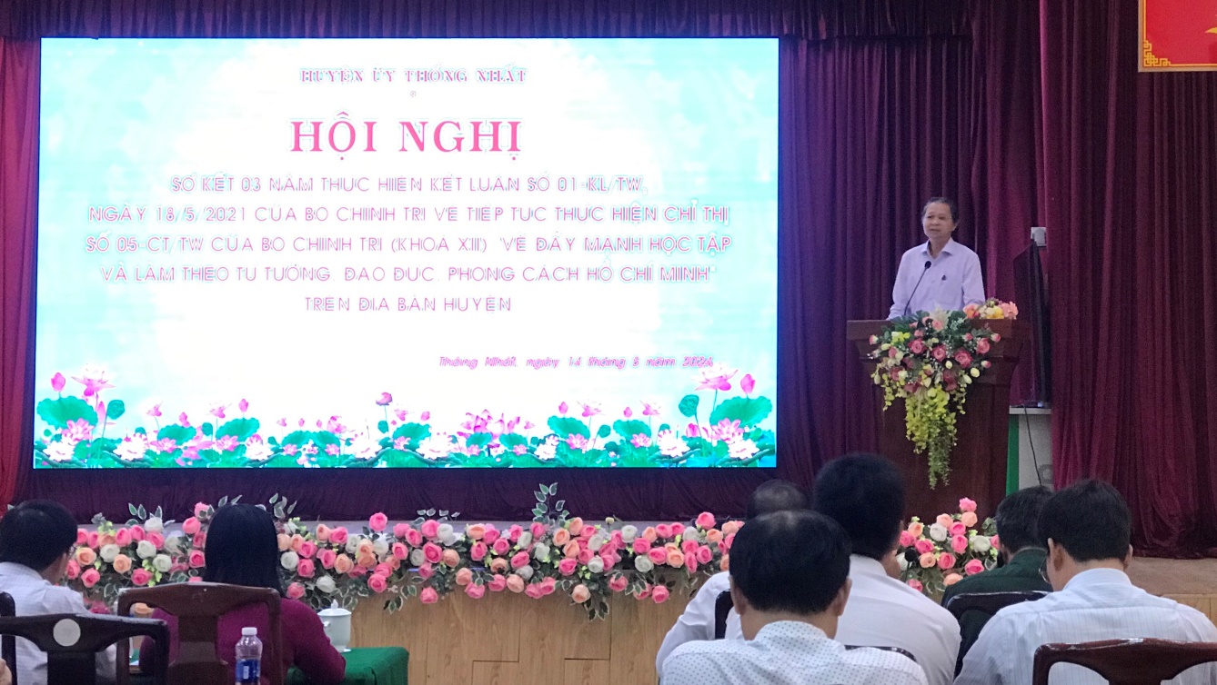 Phát biểu tại Hội nghị, Uỷ viên Ban Thường vụ Tỉnh uỷ, Chủ nhiệm Uỷ ban Kiểm tra Tỉnh uỷ Huỳnh Thanh Bình ghi nhận và đánh giá cao những kết quả mà huyện đã đạt được và chúc mừng các điển hình được tuyên dương tại hội nghị. Chủ nhiệm Uỷ ban kiểm tra Tỉnh uỷ lưu ý trong thời gian tới, huyện cần tiếp tục triển khai thực hiện sâu rộng hơn Kết luận số 01-KL/TW của Bộ Chính trị đến cán bộ, đảng viên và mọi tầng lớp nhân dân; chú trọng phát hiện, tuyên dương và nhân rộng hơn nữa các tấm gương điển hình tiêu biểu trong học tập và làm theo Bác , tạo sức lan tỏa trong xã hội,…
