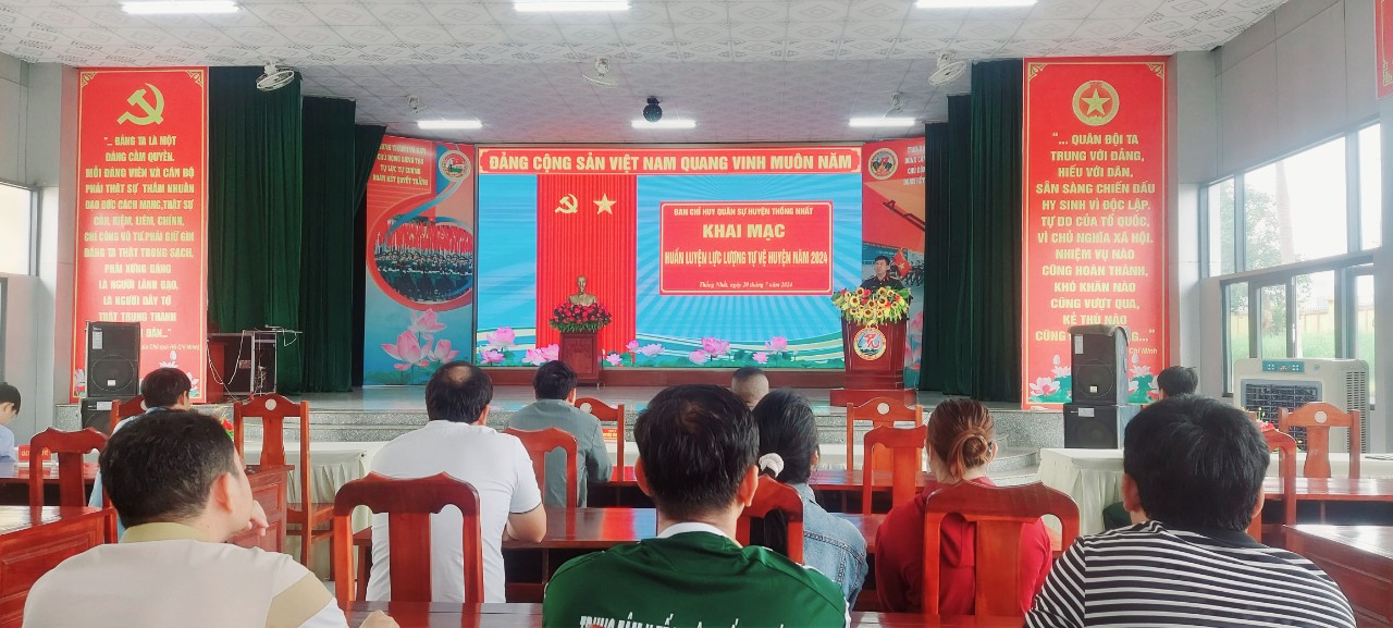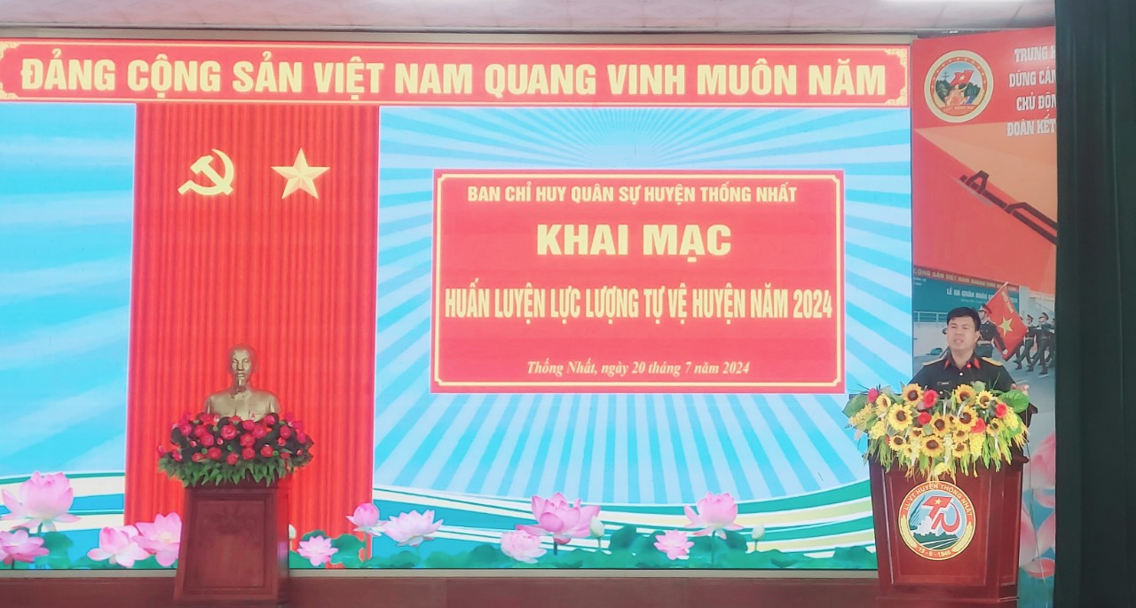 Ngày 20-7, Ban Chỉ huy quân sự huyện Thống Nhất đã tổ chức khai mạc huấn luyện lực lượng tự vệ năm 2024 cho trên 170 chiến sỹ thuộc 13 trung đội, tiểu đội tự vệ thuộc các cơ quan, ban ngành và 3 trường trung học phổ thông trên địa bàn huyện. Dự khai mạc có Thượng tá Nguyễn văn Đắc, Ủy viên Ban TVHU, Chỉ huy trưởng Ban Chỉ huy quân sự huyện.