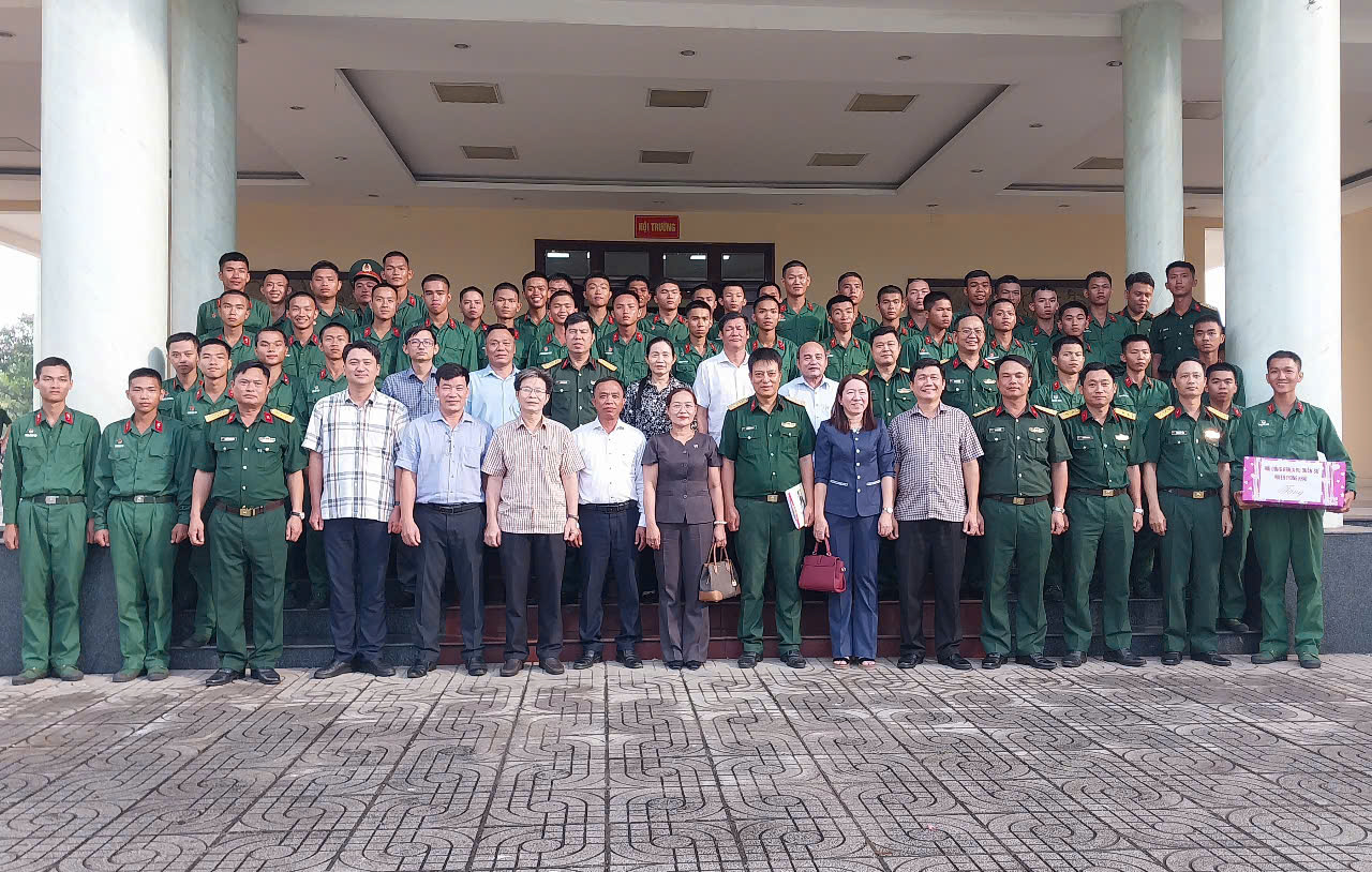 Lãnh đạo huyện Thống Nhất chụp hình lưu niệm với lãnh đạo đơn vị Pháo binh 96 và chiến sỹ mới tại đơn vị