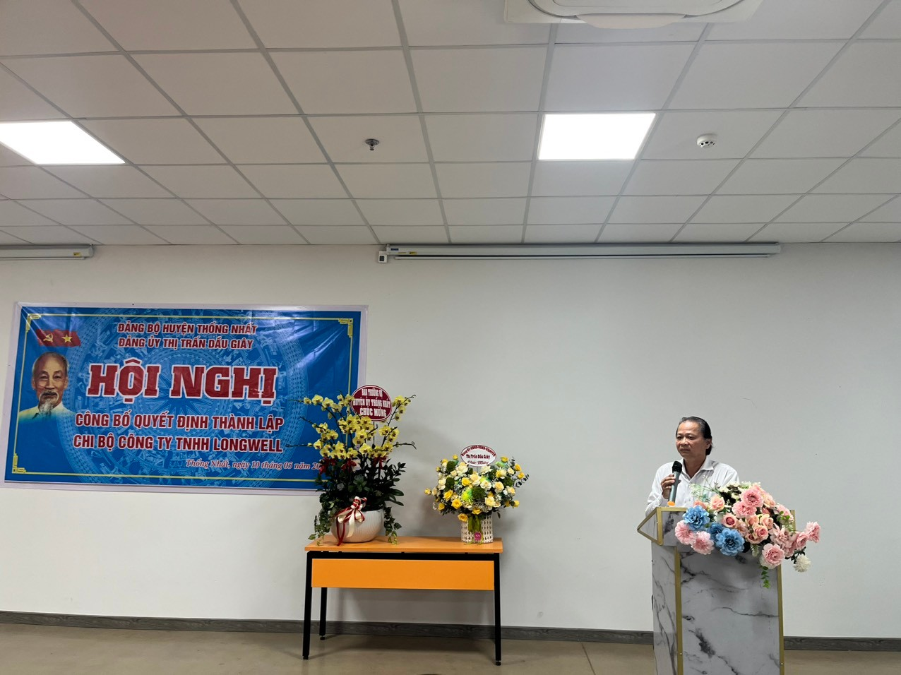 Tại Hội nghị đ/c Huỳnh Thanh Bình - Ủy viên Thường vụ Tỉnh ủy – Chủ nhiệm Ủy ban Kiểm tra Tỉnh ủy thay mặt lãnh đạo tỉnh chúc mừng và giao nhiệm vụ: Việc thành lập tổ chức đảng trong doanh nghiệp có vốn đầu tư nước ngoài là rất cần thiết đối với sự phát triển bềnh vững của doanh nghiệp và được lãnh đạo tỉnh quan tâm. Do đó trong thời gian tới đề nghị lãnh đạo huyện, Đảng bộ thị trấn Dầu Giây quan tâm, giúp đỡ và tạo điều kiện để Chi bộ hoạt động tốt. Đối với chi bộ công ty TNHH LongWell cần thể hiện tính tiên phong gương mẫu trong mọi hoạt động để thấy được vai trò của tổ chức đảng trong doang nghiệp, chú trọng công tác đào tạo, bồi dưỡng để giới thiệu cho Đảng những Đoàn viên ưu tú để xem xét kết nạp.