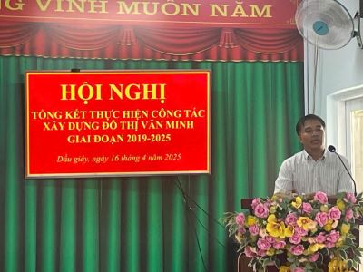 Đồng chí Trần Văn Trung- Chủ tịch UBND thị trấn Dầu Giây phát biểu tại Hội nghị tổng kết thực hiện công tác xây dựng đô thị văn minh giai đoạn 2019-2025
