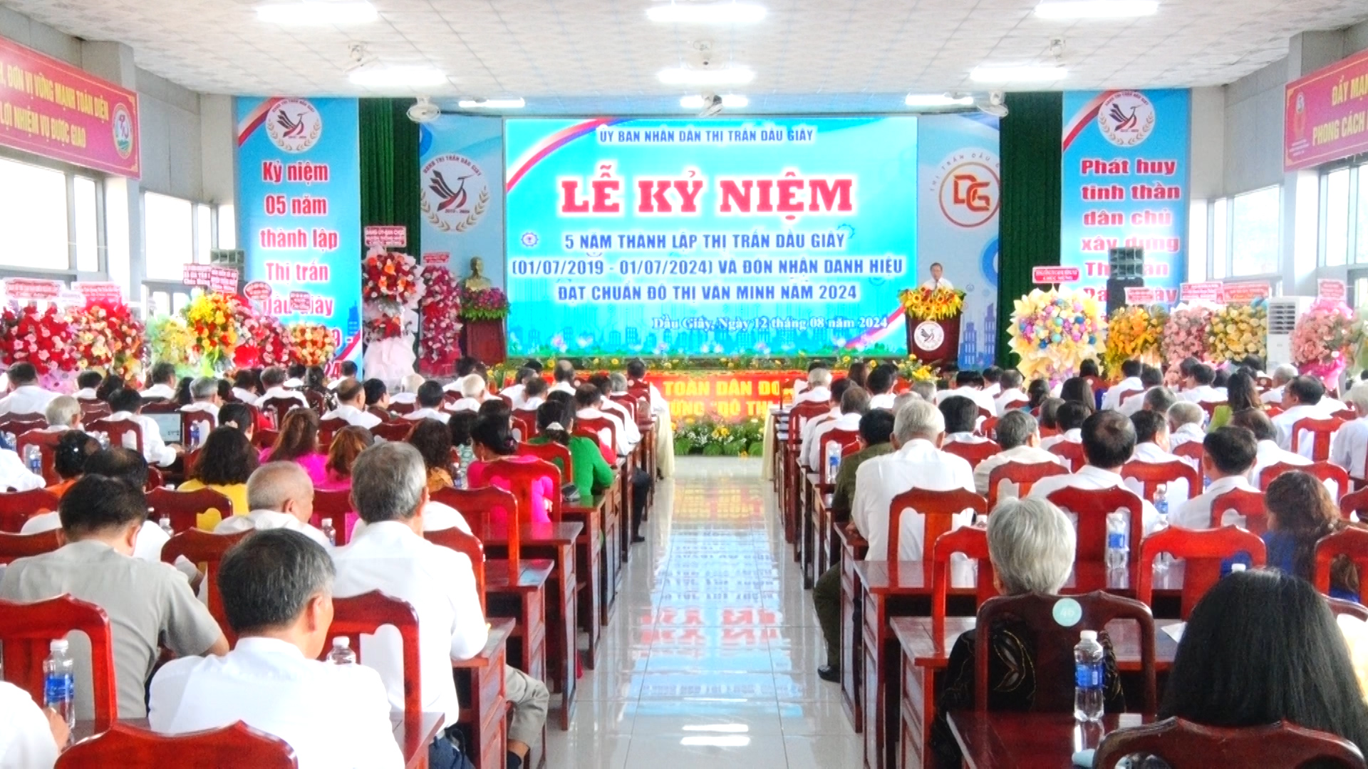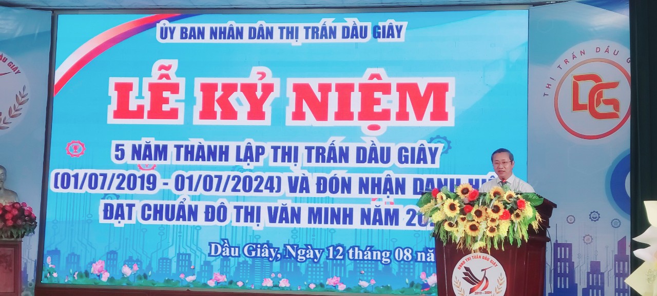 Sáng 12-8, Đảng bộ, Chính quyền và Nhân dân thị trấn Dầu Giây, huyện Thống Nhất long trọng tổ chức lễ kỷ niệm 5 năm ngày thành lập thị trấn (01/7/2019-01/7/2024) và đón nhận danh hiệu đạt chuẩn đô thị văn minh năm 2024.