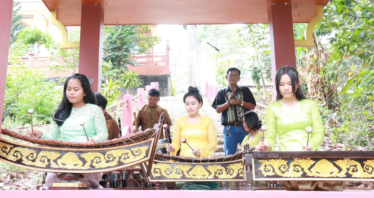 Đồng bào khơme ở huyện Định Quán tổ chức dạy đàn ngũ âm cho thế hệ trẻ (Ảnh: Văn Truyên)