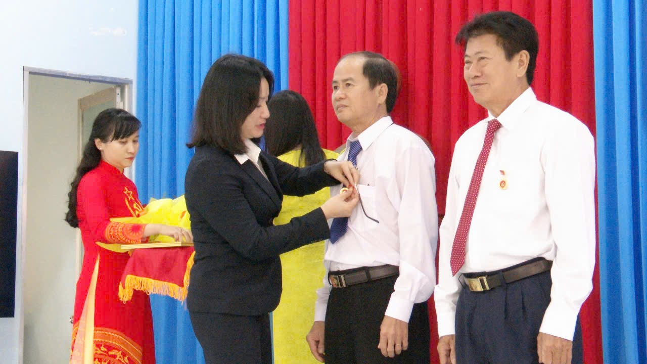 Đồng chí Bùi Thị Minh Thúy, Bí thư Đảng ủy, Chủ tịch HĐND xã gắn huy hiệu 30 năm tuổi Đảng cho các đồng chí đảng viên