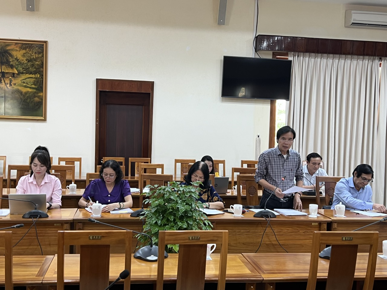 Đ/c Giang Mạnh Hà, Bí thư Đảng đoàn, Chủ tịch Hội Văn học nghệ thuất tỉnh báo cáo tại buổi làm việc