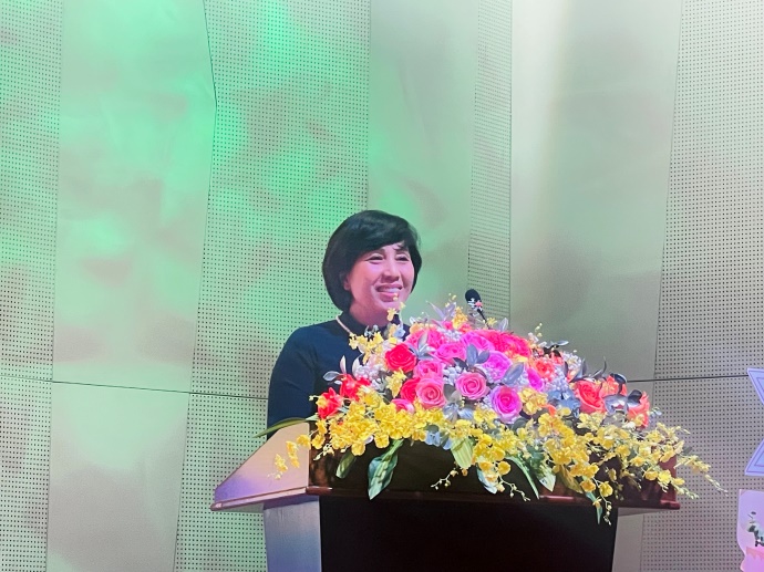 Bà Lê Nhật Thùy - Phó Tổng Giám đốc Công ty Cổ phần Chăn nuôi C.P Việt Nam phát biểu tại buổi lễ