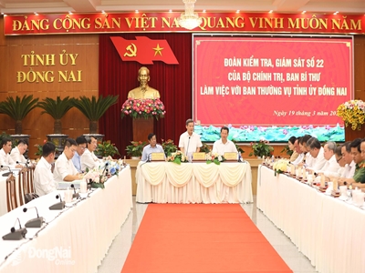Ngày 19-3, Đoàn kiểm tra, giám sát số 22 của Bộ Chính trị, Ban Bí thư do đồng chí Lê Minh Trí, Ủy viên Bộ Chính trị, Bí thư Trung ương Đảng, Trưởng ban Nội chính Trung ương làm trưởng đoàn đã làm việc với Ban Thường vụ Tỉnh ủy Đồng Nai để thông qua dự thảo báo cáo kết quả giám sát việc lãnh đạo, chỉ đạo, tổ chức nghiên cứu, học tập, quán triệt, tuyên truyền và triển khai thực hiện Nghị quyết Đại hội XIV của Đảng; việc lãnh đạo, chỉ đạo, tổ chức thực hiện Chỉ thị số 01-CT/TW ngày 23-1-2026 của Bộ Chính trị về nghiên cứu, học tập, quán triệt, tuyên truyền và triển khai thực hiện Nghị quyết Đại hội XIV của Đảng; Chỉ thị số 46-CT/TW, ngày 16-5-2025 của Bộ Chính trị về lãnh đạo cuộc bầu cử đại biểu Quốc hội khóa XVI và đại biểu HĐND các cấp nhiệm kỳ 2026-2031.