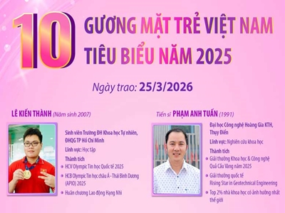 10 Gương mặt trẻ Việt Nam tiêu biểu năm 2025 2 Tối 25-3-2026, tại Thủ đô Hà Nội, Trung ương Đoàn TNCS Hồ Chí Minh, Quỹ Hỗ trợ Tài năng trẻ Việt Nam tổ chức Lễ trao Giải thưởng Gương mặt trẻ Việt Nam tiêu biểu năm 2025.
