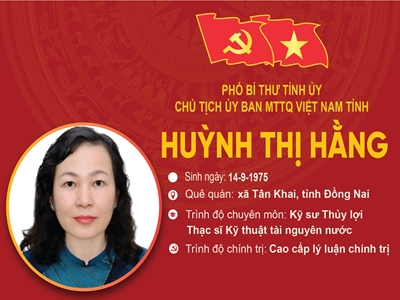 [Infographic] Tóm tắt quá trình công tác của đồng chí Huỳnh Thị Hằng, Phó Bí thư Tỉnh ủy, Chủ tịch Ủy ban MTTQ Việt Nam tỉnh Đồng Nai 34 Trong 2 ngày 29 và 30-9, tại Trung tâm Hội nghị tỉnh, Đảng bộ tỉnh Đồng Nai đã long trọng tổ chức Đại hội đại biểu Đảng bộ tỉnh lần thứ I, nhiệm kỳ 2025-2030. Theo đó, đại hội đã công bố Quyết định của Bộ Chính trị chỉ định Ban Chấp hành, Ban Thường vụ, Bí thư, Phó Bí thư Tỉnh ủy Đồng Nai nhiệm kỳ 2025-2030. Báo và Phát thanh, Truyền hình Đồng Nai trân trọng giới thiệu tóm tắt quá trình công tác của đồng chí Huỳnh Thị Hằng, Phó Bí thư Tỉnh ủy, Chủ tịch Ủy ban MTTQ Việt Nam tỉnh Đồng Nai.