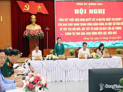 Tỉnh ủy Đồng Nai tổng kết thực hiện Nghị quyết số 18 về tiếp tục đổi mới, sắp xếp tổ chức bộ máy của hệ thống chính trị tinh gọn, hoạt động hiệu lực, hiệu quả 14/10/2025 11:09:17 37 Sáng 14-10, Tỉnh ủy Đồng Nai tổ chức Hội nghị tổng kết thực hiện Nghị quyết số 18-NQ/TW ngày 25-10-2017 của Ban Chấp hành Trung ương Đảng về tiếp tục đổi mới, sắp xếp tổ chức bộ máy của hệ thống chính trị tinh gọn, hoạt động hiệu lực, hiệu quả. Hội nghị được tổ chức trực tiếp tại Hội trường Tỉnh ủy, kết nối trực tuyến đến 95 điểm cầu xã, phường trong tỉnh.