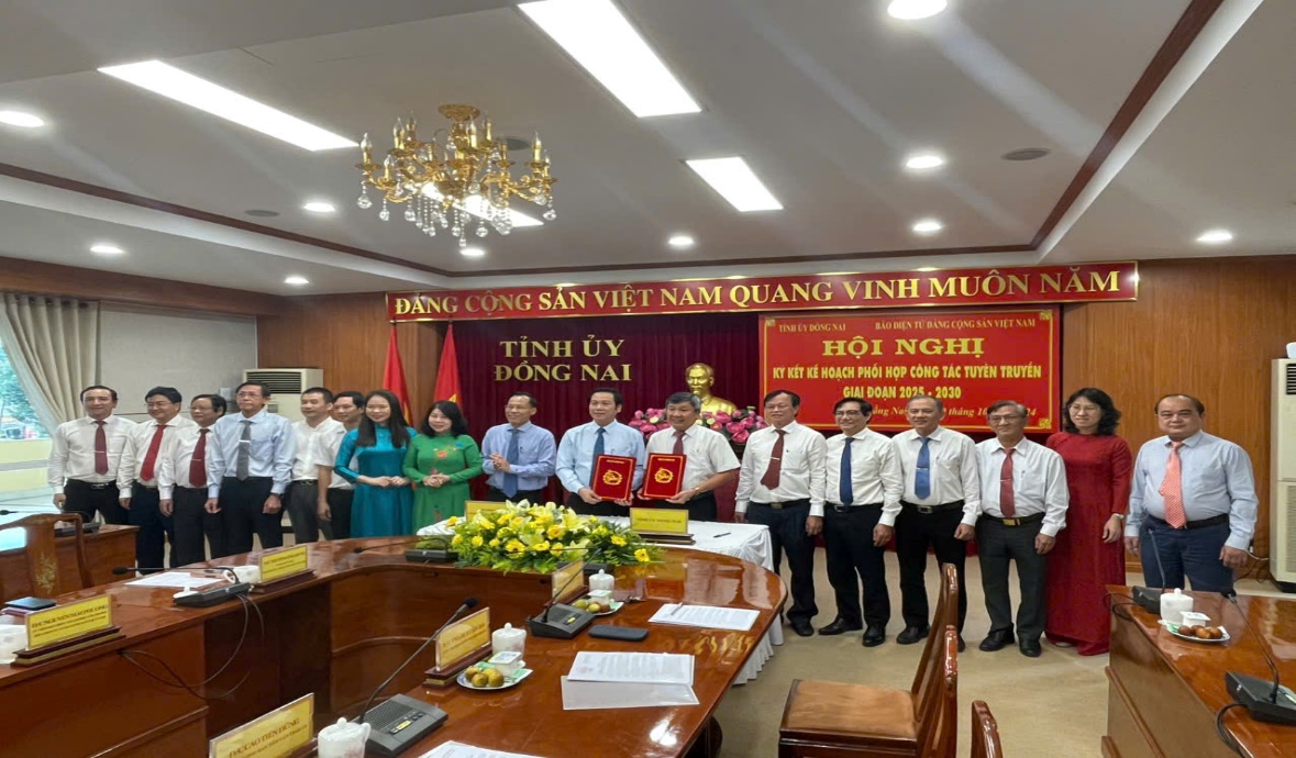 Vừa qua, tại phòng họp BCH Đảng bộ tỉnh đã diễn ra lễ ký kết Kế hoạch phối hợp công tác tuyên truyền giai đoạn 2025-2030 giữa Tỉnh ủy Đồng Nai và Báo Điện tử Đảng Cộng sản Việt Nam. Tham dự hội nghị, về phía tỉnh Đồng Nai có các đồng chí: Hồ Thanh Sơn, Phó Bí thư Thường trực Tỉnh ủy; Phạm Xuân Hà, UVTV, Trưởng ban Ban Tuyên giáo Tỉnh ủy; Cao Tiến Dũng, UVTV, Trưởng ban Ban Dân vận Tỉnh ủy; Nguyễn Sơn Hùng, TUV, Phó Chủ tịch UBND tỉnh; Hoàng Thị Bích Hằng, TUV, Phó Chủ tịch HĐND tinh; lãnh đạo các ban đảng và Văn phòng Tỉnh ủy; Sở Thông tin và Truyền thông; Báo Đồng Nai; Đài Phát thanh và Truyền hình Đồng Nai; Hội Nhà báo tỉnh.