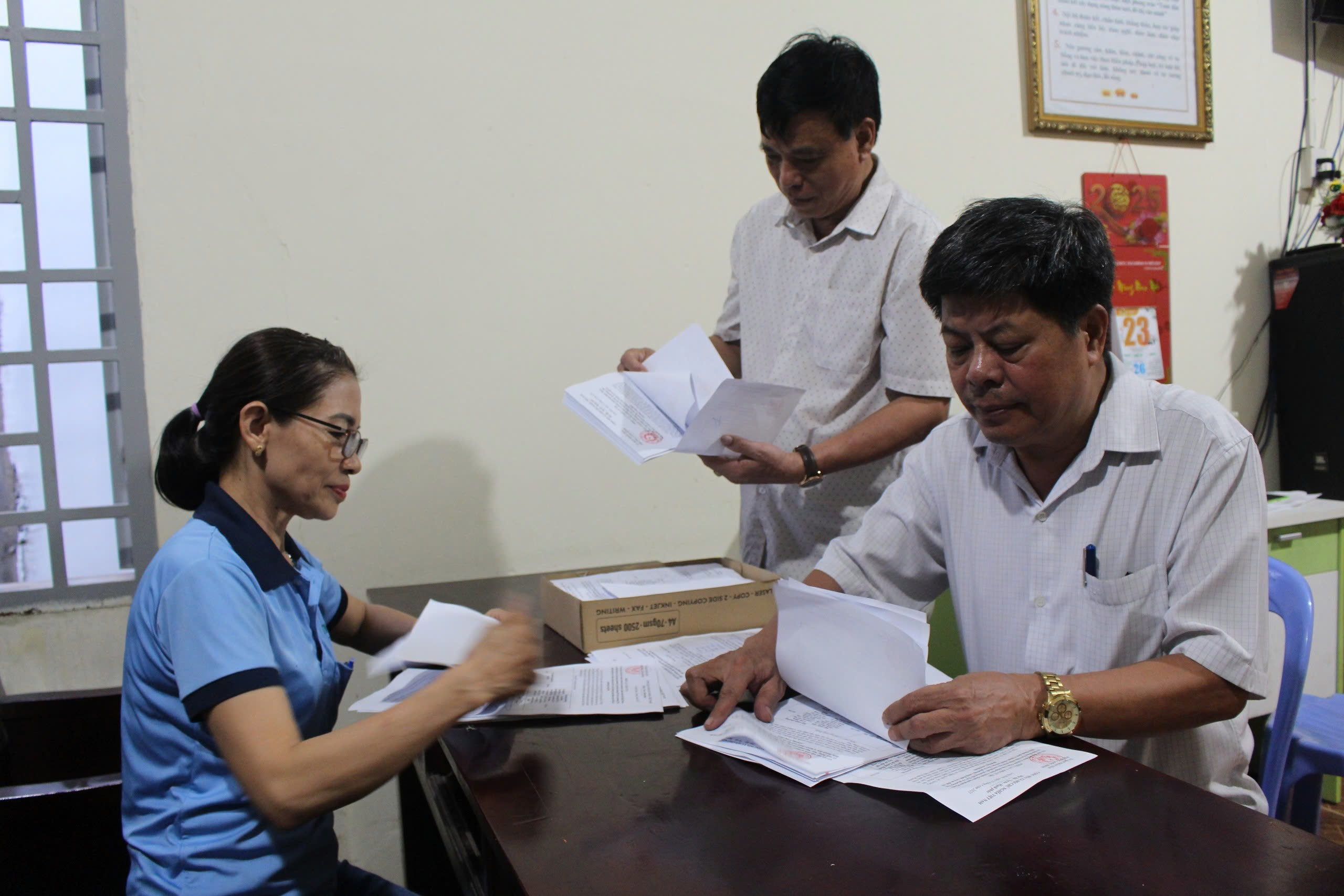Cán bộ khu phố 7 (phường Long Bình, thành phố Biên Hòa) tiến hành phát phiếu và tổng hợp ý kiến của cử tri về đề án sắp xếp ĐVHC cấp xã của tỉnh