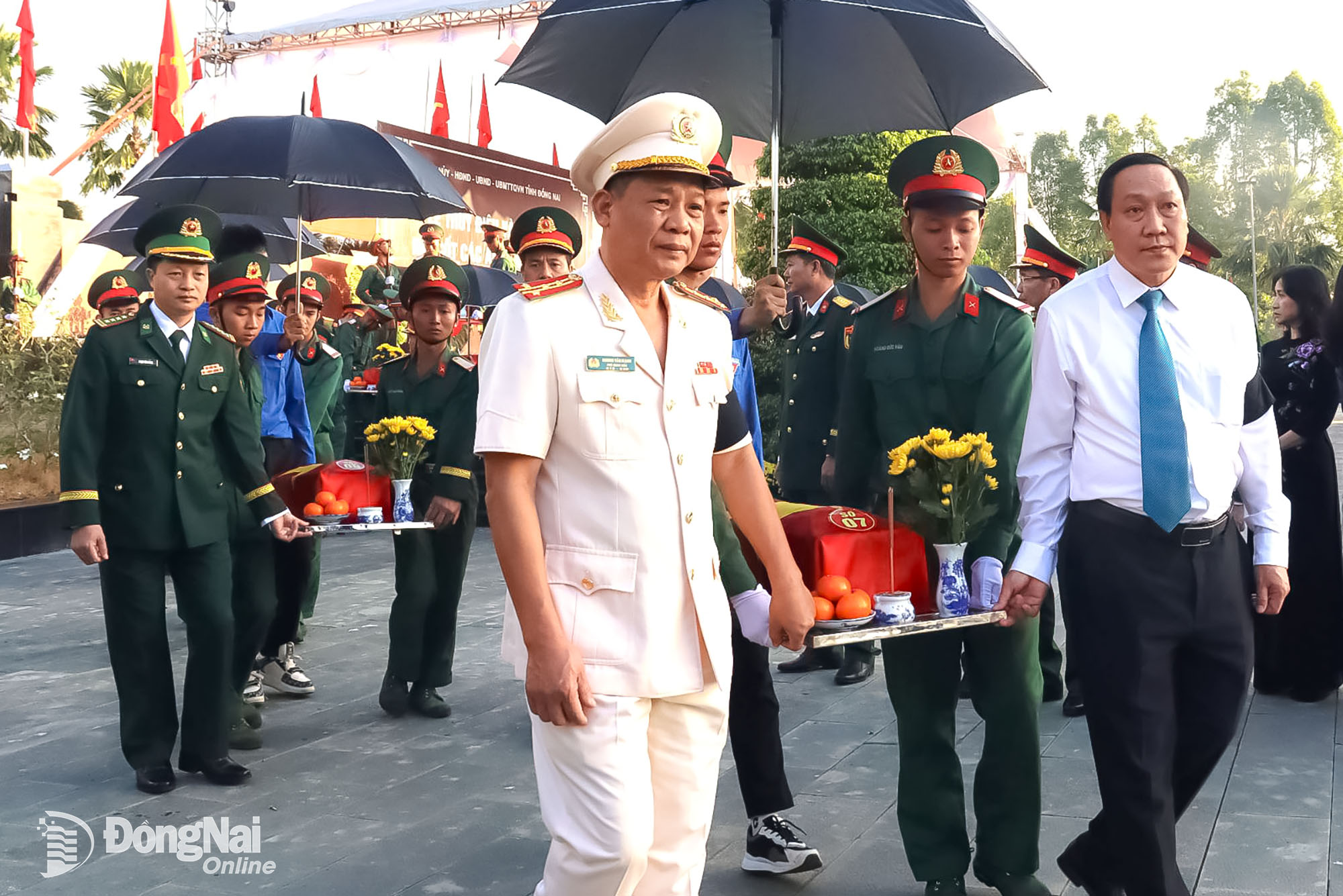 | Thủ trưởng Bộ Quốc phòng, Quân khu 7, lãnh đạo tỉnh Đồng Nai và đại biểu thực hiện các nghi thức tưởng niệm, an táng hài cốt liệt sĩ. Ảnh: Nguyệt Hà |