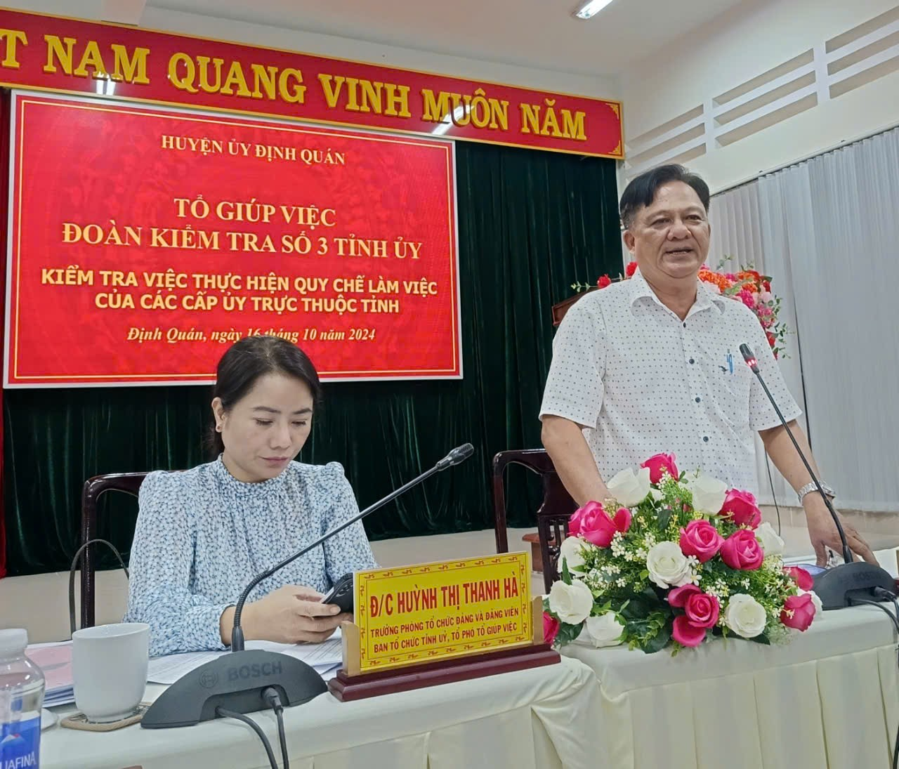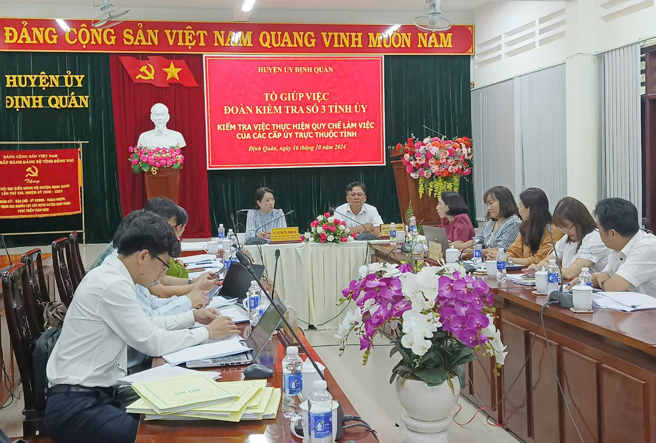 Ngày 16/10, Tổ giúp việc đoàn kiểm tra số 3 Tỉnh ủy về thực hiện Quy chế làm việc của các cấp ủy trực thuộc tỉnh đã đến làm việc bước đầu tại Huyện ủy Long Thành và Định Quán. Qua đó, nhằm rà soát trước nhiệm vụ, kết quả thực hiện của các cấp ủy và yêu cầu bổ sung các nội dung cần làm rõ trước khi Đoàn kiểm tra đến làm việc. Việc kiểm tra Quy chế làm việc của các cấp ủy trực thuộc tỉnh để Ban Thường vụ Tỉnh ủy nắm tình hình, đánh giá vai trò, trách nhiệm việc lãnh đạo, chỉ đạo của các cấp ủy và trách nhiệm, quyền hạn của các đồng chí cấp ủy viên trong việc triển khai, thực hiện Quy chế làm việc.