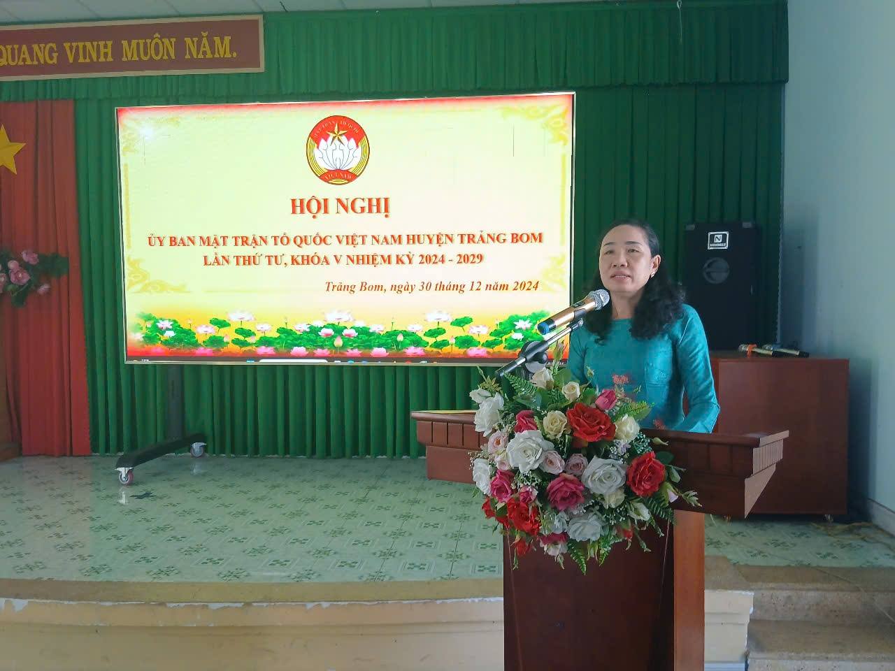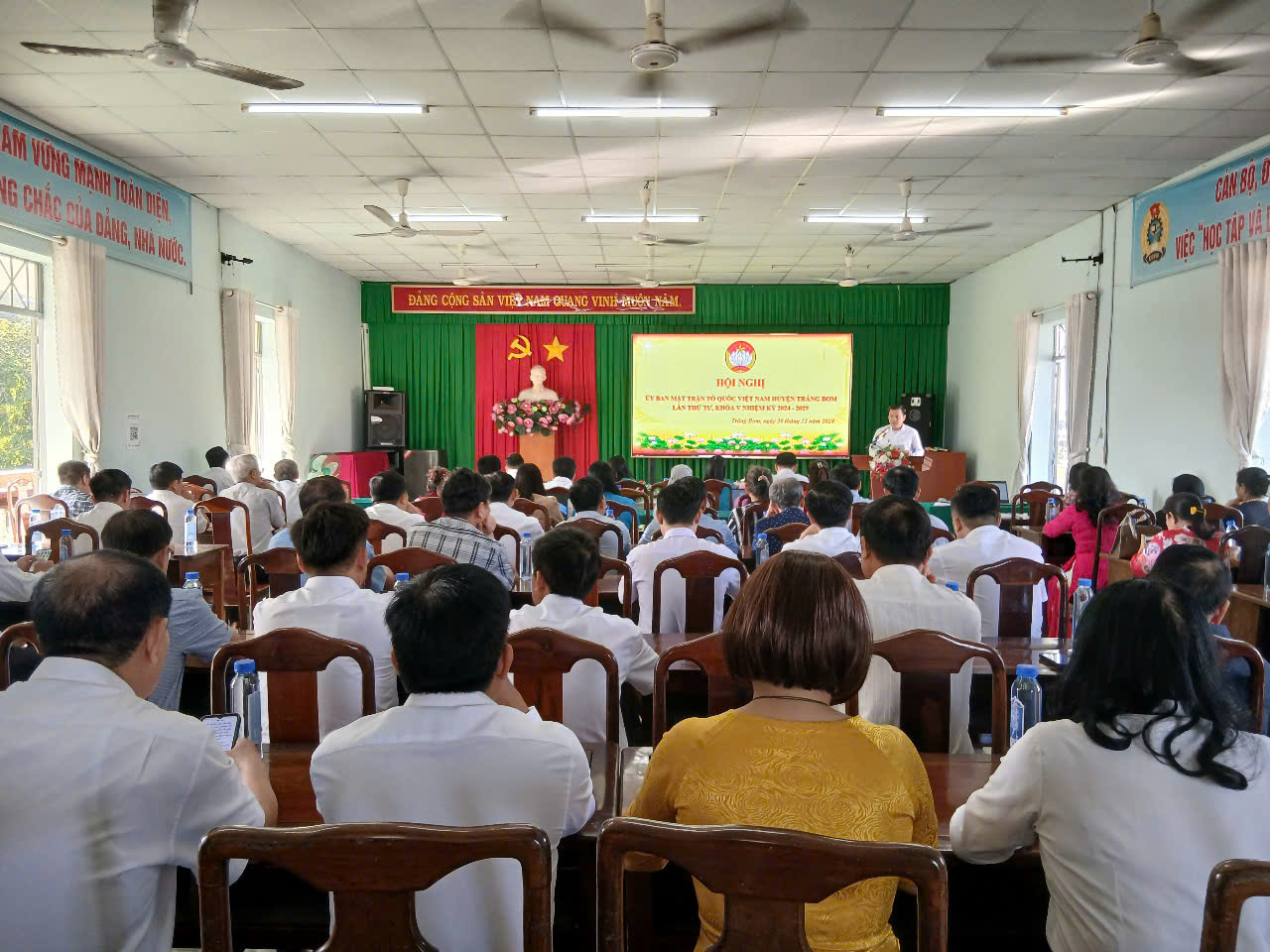 Thực hiện Chương trình phối hợp thống nhất hành động năm 2024; sáng ngày 30/12/2024, Ủy ban MTTQ Việt Nam huyện Trảng Bom đã tổ chức Hội nghị lần thứ tư khóa V, nhiệm kỳ 2024 - 2029; tham dự Hội nghị có bà Nguyễn Thị Nga - Phó Bí thư Thường trực Huyện ủy - Chủ tịch HĐND huyện; bà Lưu Thị Ngọc Quế - UV.BTV Huyện ủy - Phó Chủ tịch HĐND huyện; ông Lê Mạnh Hùng - HUV - Phó Chủ tịch UBND huyện; ông Đào Xuân Hồng - HUV, Chủ tịch Uỷ ban MTTQ Việt Nam huyện; đại diện lãnh đạo của các cơ quan phối hợp, 52/63 vị ủy viên Ủy ban MTTQ huyện khóa V, nhiệm kỳ 2024 - 2029; các vị của 02 Ban tư vấn của UB.MTTQ huyện; Đại diện Ban Thường trực Ủy ban MTTQ Việt Nam các xã, thị trấn; Các vị được nhận Kỷ niệm chương, các tập thể, cá nhân được khen thưởng trong công tác năm 2024 của tỉnh và huyện;