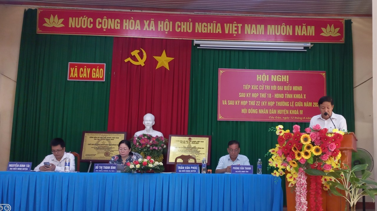 Sáng ngày 12/8/2024, tại Hội trường UBND xã Cây Gáo đã diễn ra Hội nghị tiếp xúc cử tri sau kỳ họp thứ 18 HĐND tỉnh khóa X và sau kỳ họp thứ 22 (kỳ họp thường lệ giữa năm HĐND Huyện khóa IV, nhiệm kỳ 2021-2026. Về tham dự buổi tiếp xúc có ông Phùng Văn Thanh – Giám đốc bệnh viện Y học cổ truyền, Sở Y tế- Đại biểu HĐND tỉnh; Tổ đại biểu HĐND huyện Trảng Bom đơn vị số 9 có bà Đỗ Thị Thanh Bình, trưởng Ban Kinh tế HĐND huyện, ông Nguyễn Đình Tài, trưởng phòng tài chính - kế hoạch huyện, ông Trần Văn Phúc, Bí thư Đảng ủy – CT HĐND xã Cây Gáo; lãnh đạo các phòng ban, ngành huyện; Thường trực HĐND; TT UBND, TT UBMTTQVN xã, các ban ngành đoàn thể xã và 50 cử tri trên địa bàn xã Cây Gáo về tham dự.