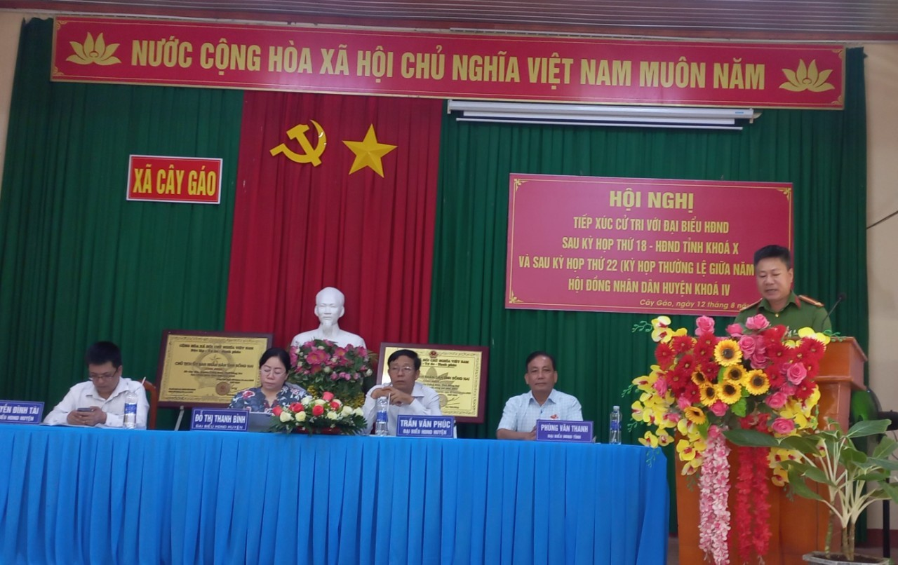 Qua buổi tiếp xúc, Tổ đại biểu đã ghi nhận 07 lượt ý kiến, kiến nghị của cử tri về các vấn đề liên quan đến An toàn giao thông, Bảo hiểm y tế, nguồn vốn vay của CLB Hoàn lương, đề xuất đặt điểm giao dịch ngân hàng Agribank trên địa bàn phục vụ nhu cầu giao dịch cho bà con...Phần lớn các ý kiến, kiến nghị của cử tri đã được lãnh đạo UBND xã Cây Gáo, Công an xã Cây Gáo, lãnh đạo các ngành chuyên môn huyện trả lời cụ thể, được bà con cử tri đồng thuận cao.