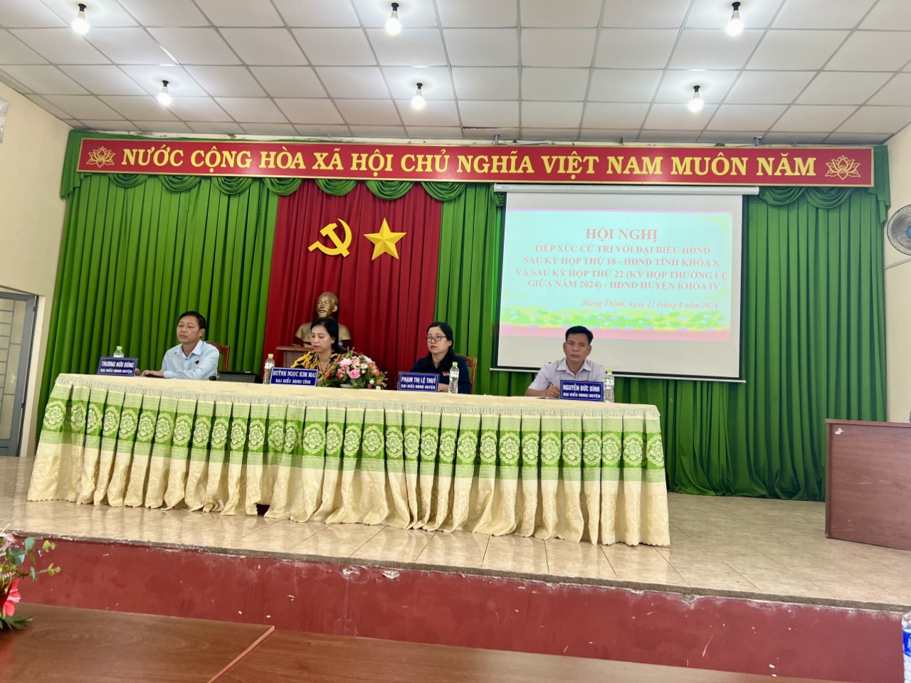 Căn cứ thông báo số 71/TB-HĐND ngày 02/8/2024 của TT-HĐND huyện Trảng Bom V/v tiếp xúc cử tri sau Kỳ họp thứ 18 HĐND tỉnh khóa X và sau kỳ họp thường lệ giữa năm 2024 HĐND huyện khóa IV. Thường trực UB.MTTQ Việt Nam xã Hưng Thịnh, tổ chức Hội nghị tiếp xúc giữa cử tri xã Hưng Thịnh với đại biểu HĐND tỉnh Đồng Nai; đại biểu HĐND huyện Trảng Bom nhằm thông báo nội dung chính thuộc chương trình kỳ họp thứ 18 - kỳ họp thường lệ giữa năm 2024 HĐND tỉnh và sau kỳ họp thường lệ giữa năm 2024 HĐND huyện khóa IV, đồng thời trả lời các ý kiến của cử tri sau kỳ họp của HĐND. Về dự Hội nghị tiếp xúc cử có Đại biểu HĐND tỉnh Đồng Nai: Đồng chí Huỳnh Ngọc Kim Mai – Thường trực HĐND tỉnh – Trưởng Ban Văn hoá xã hội HĐND tỉnh Đồng Nai.