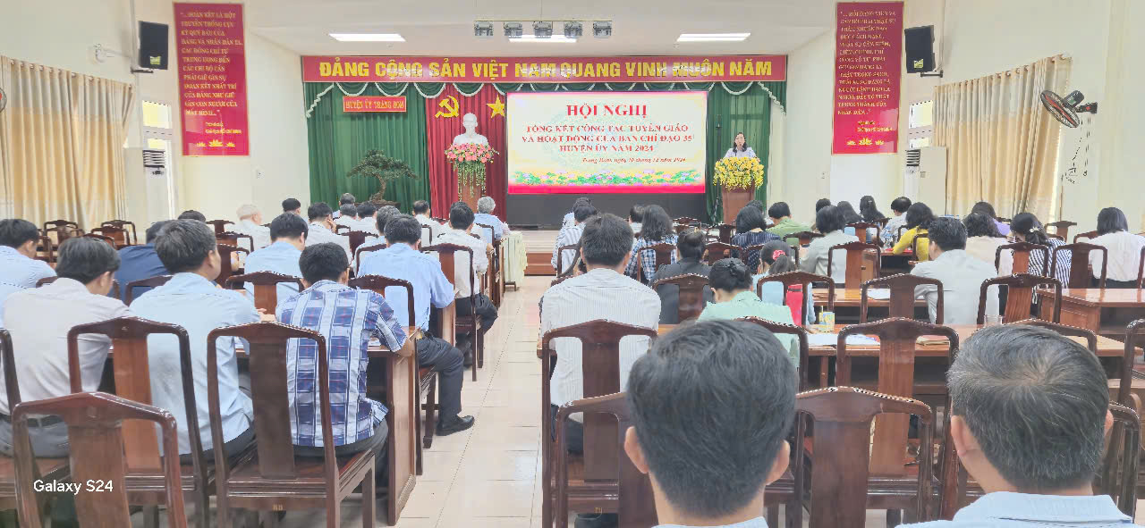 Ngày 10/12/2024, Ban Tuyên giáo Huyện ủy Trảng Bom tổ chức Hội nghị tổng kết công tác Tuyên giáo và hoạt động của Ban Chỉ đạo 35 Huyện ủy năm 2024, triển khai nhiệm vụ năm 2025. Dự Hội nghị có đồng chí Đoàn Trung Kiên - Phó Trưởng phòng Lý luận Chính trị - Lịch sử Đảng, Ban Tuyên giáo Tỉnh ủy; đồng chí Nguyễn Thị Nga, Phó Bí thư Thường trực Huyện ủy, Chủ tịch HĐND huyện; Các đồng chí thành viên Ban Chỉ đạo 35 Huyện ủy; thành viên Tổ thư ký Ban Chỉ đạo 35 Huyện ủy; Lãnh đạo MTTQ và các đoàn thể chính trị - xã hội huyện, Trung tâm Chính trị huyện; Lãnh đạo các cơ quan thuộc khối tuyên truyền, khối khoa giáo huyện; Lãnh đạo các cơ quan phối hợp theo Quy chế số 238-QC/TW của Ban Bí thư Trung ương Đảng; Các đồng chí Báo cáo viên Huyện ủy; Bí thư các Chi, Đảng bộ cơ sở; Trưởng và Phó Ban Tuyên giáo các xã, thị trấn.
