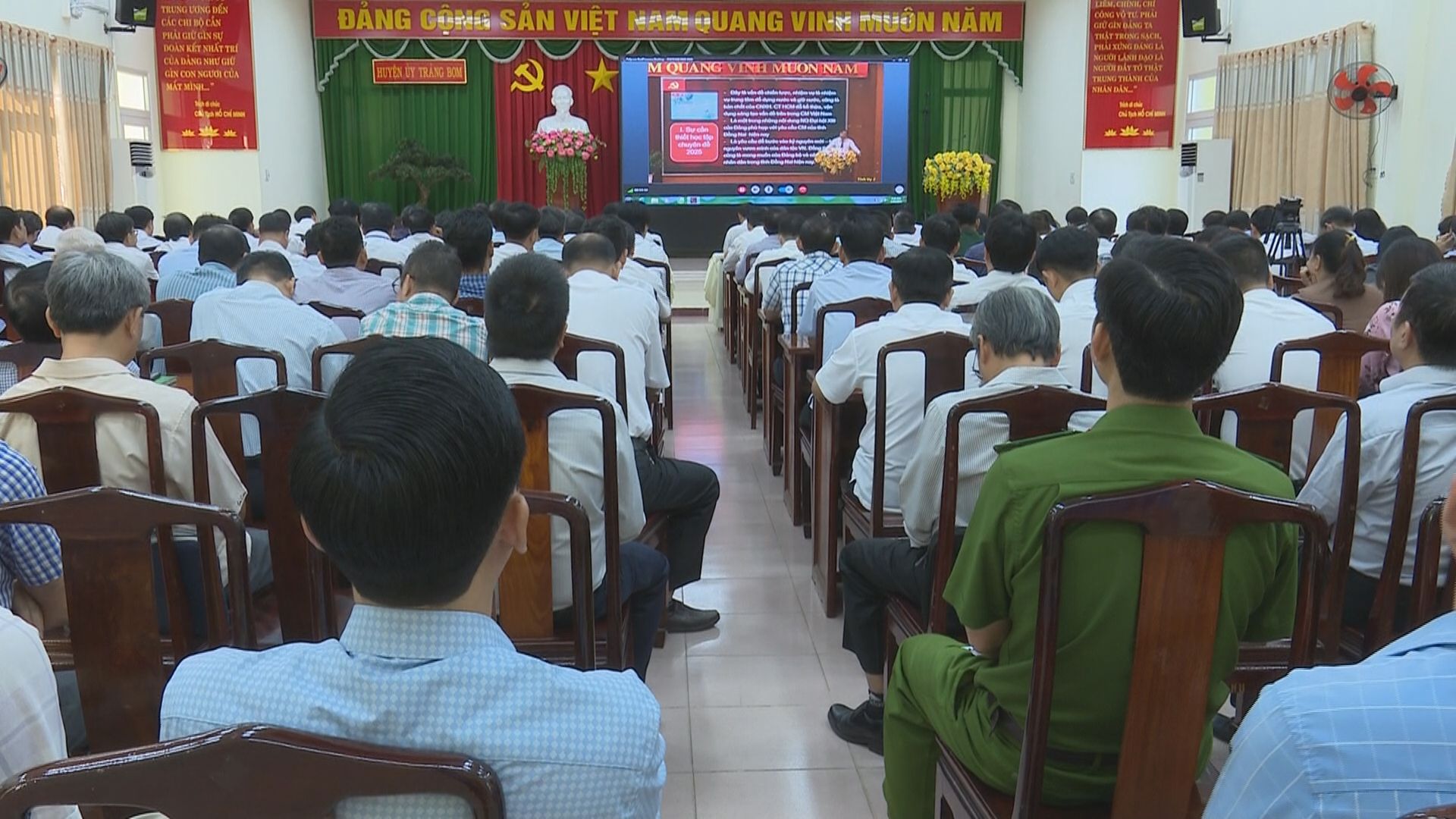 Tham dự tại điểm cầu huyện Trảng Bom có đồng chí Lê Tuấn Anh - Tỉnh ủy viên, Bí thư Huyện ủy; Thường trực Huyện ủy-HĐND-UBND-UB.MTTQ huyện; các đồng chí Ủy viên Ban Chấp hành Đảng bộ huyện; Ủy viên Ủy ban Kiểm tra; các đồng chí Báo cáo viên Huyện ủy; Trưởng, phó; Lãnh đạo các cơ quan, ban, ngành và các đoàn thể huyện, các Ban Đảng, Văn phòng Huyện ủy, Trung tâm Chính trị, các Ban HĐND huyện; Bí thư, Phó Bí thư các Chi, Đảng bộ trực thuộc huyện; Chủ tịch, các Phó Chủ tịch HĐND, UBND, UB.MTTQVN, Phó Ban Tuyên giáo các xã, thị trấn.