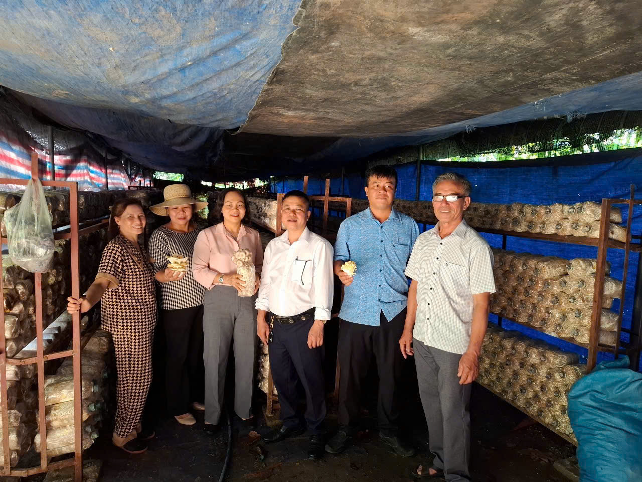 Hình: Đoàn thăm quan quan trực tiếp mô hình trồng nấm bào ngư tại xã An Viễn