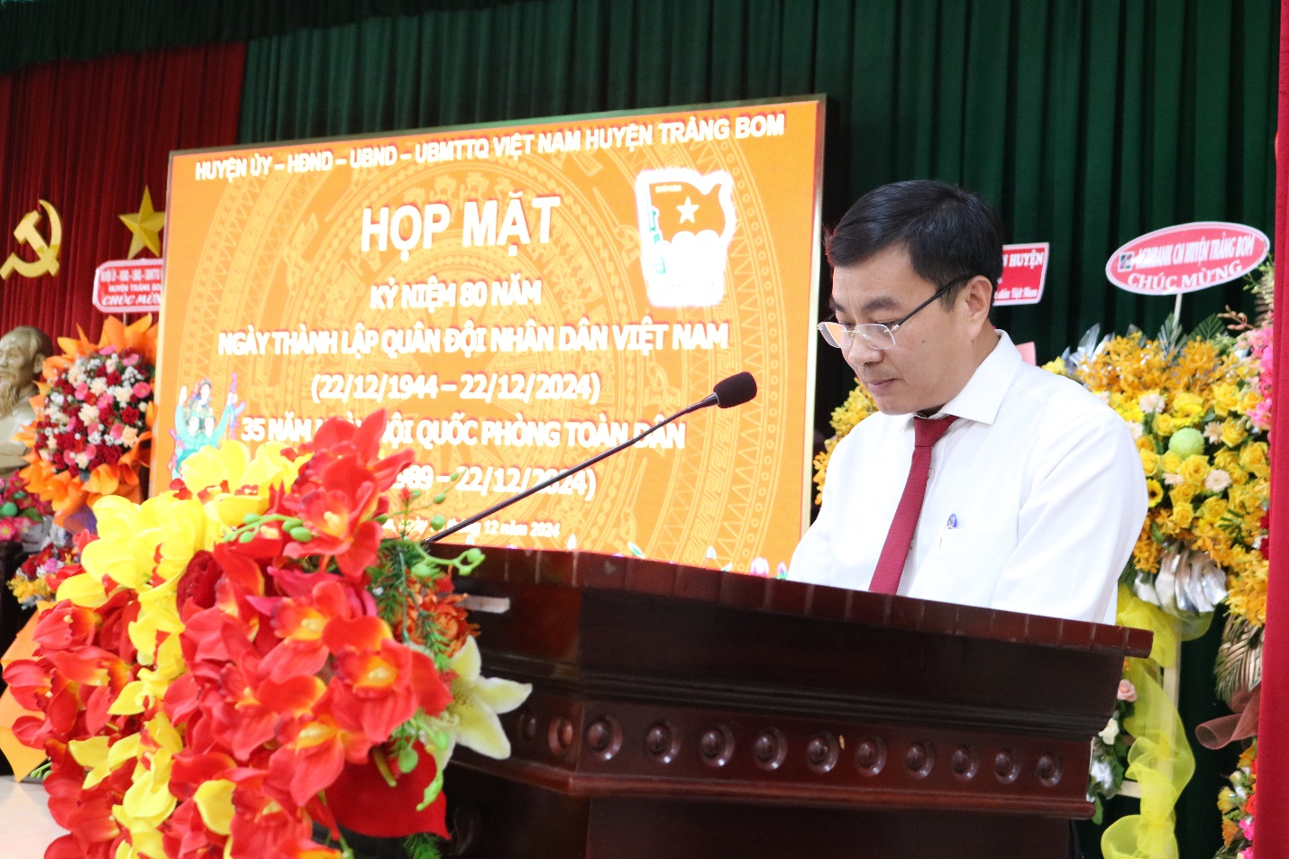 Phát biểu tại buổi họp mặt, Chủ tịch UBND huyện Trảng Bom, Lê Ngọc Tiên đã bày tỏ sự ghi nhận và lòng biết ơn các thế hệ lực lượng vũ trang huyện Trảng Bom qua các thời kỳ đã không ngừng khơi dậy niềm tự hào, phát huy chủ nghĩa anh hùng cách mạng, nâng cao lòng yêu nước, yêu chủ nghĩa xã hội; ý chí tự lực, tự cường, vượt qua mọi khó khăn, thử thách; tập trung xây dựng Đảng bộ, chính quyền Mặt trận Tổ quốc và các tổ chức chính trị - xã hội trong sạch, vững mạnh, hoạt động hiệu lực, hiệu quả; đẩy mạnh phát triển kinh tế, văn hóa xã hội, tăng cường quốc phòng, an ninh. Từ đó, góp phần xây dựng quê hương huyện Trảng Bom ngày càng giàu đẹp, văn minh, hiện đại, phát triển bền vững; xây dựng lực lượng vũ trang huyện vững mạnh, đáp ứng yêu cầu nhiệm vụ bảo vệ Tổ quốc trong thời kỳ mới.