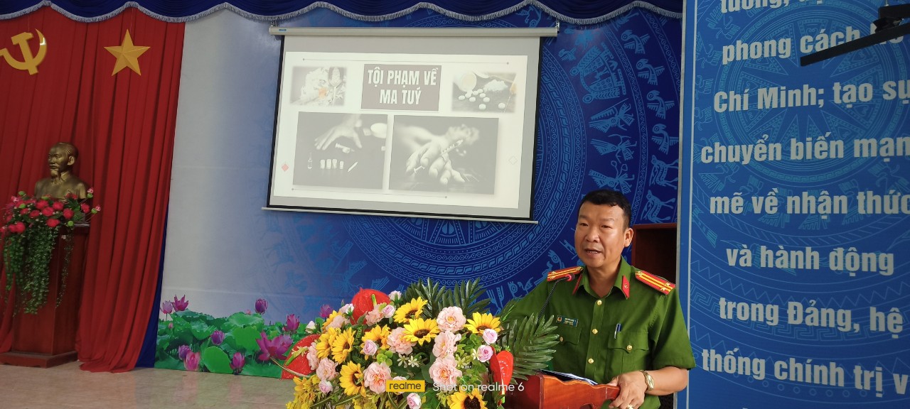 Trung tá Bùi Phi Long-Đảng ủy viên, Trưởng Công an xã đã thông tin, tuyên truyền các nội dung chính về Luật cư trú năm 2020; Luật Căn cước công dân năm 2023; tình hình an ninh chính trị, an toàn giao thông, phòng chống ma túy, phòng cháy chữa cháy và các hình thức lừa đảo trên không gian mạng.