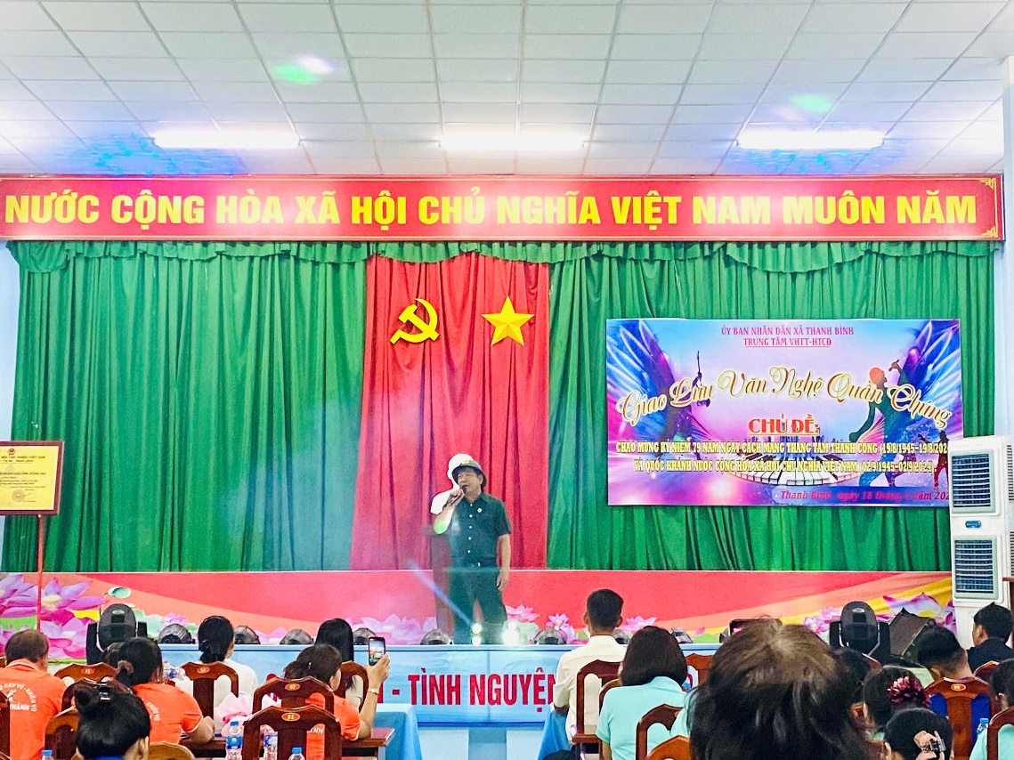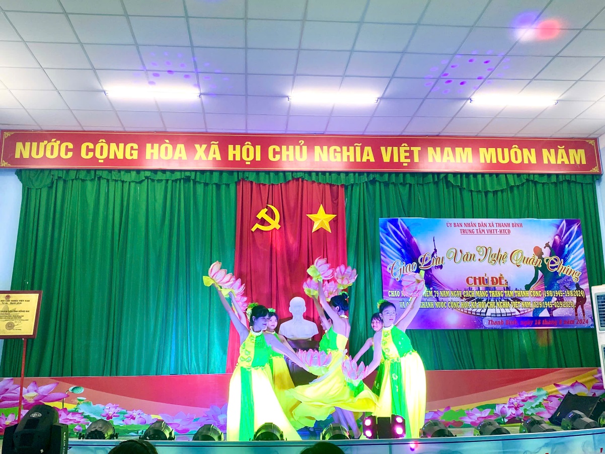 Căn cứ Kế hoạch số 143/KH-UBND ngày 16/4/2024 của UBND tỉnh Đồng Nai về kế hoạch tổ chức kỷ niệm các ngày lễ lớn trong năm 2024 và được sự thống nhất UBND xã. Tối ngày 18/8/2024, Trung tâm VHTT-HTCĐ xã Thanh Bình tổ chức Giao lưu văn nghệ nhân ngày Kỷ niệm 79 năm ngày Cách mạng tháng Tám thành công (19/8/1945-19/8/2024) và Quốc khánh nước Cộng hòa xã hội chủ nghĩa Việt Nam (02/9/1945-02/9/2024). Tới dự chương trình có đồng chí Trịnh Thị Ngọc Mai - Phó CT.UBND xã; đồng chí Nguyễn Thị Ngọc Hà - Chủ tịch hội LHPN xã, cùng các đồng chí Trưởng các ban, ngành, đoàn thể xã và hơn 120 người dân xã nhà tham dự thưởng thức văn nghệ.