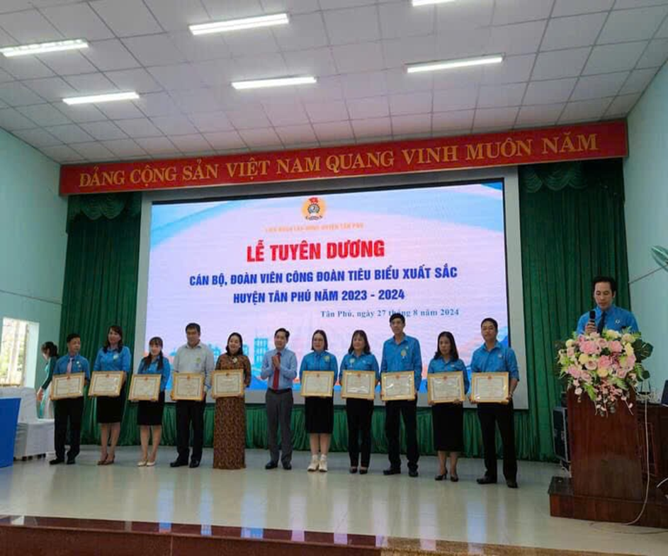 Sáng ngày 28/7/2024, Liên đoàn Lao động (LĐLĐ) huyện Tân Phú tổ chức tuyên dương cán bộ, đoàn viên Công đoàn tiêu biểu xuất sắc năm 2023-2024. Đến dự lễ tuyên dương có các đồng chí: Trần Quang Tú, TUV, Bí thư Huyện ủy Tân Phú; Huỳnh Phước Sang, Phó Chủ tịch LĐLĐ tỉnh; Phan Văn Tùng, UVTVHU, Phó chủ tịch HĐND huyện; Phạm Duy Thi, UVTVHU, Phó chủ tịch UBND huyện; Ngô Thị Hợi, Chủ tịch LĐLĐ huyện; đại diện lãnh đạo các ban, ngành, đoàn thể huyện; lãnh đạo các Công đoàn cơ sở và các cán bộ, đoàn viên Công đoàn tiêu biểu xuất sắc năm 2023-2024 được tuyên dương.