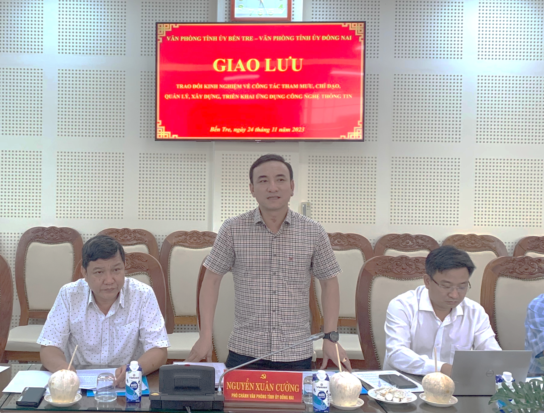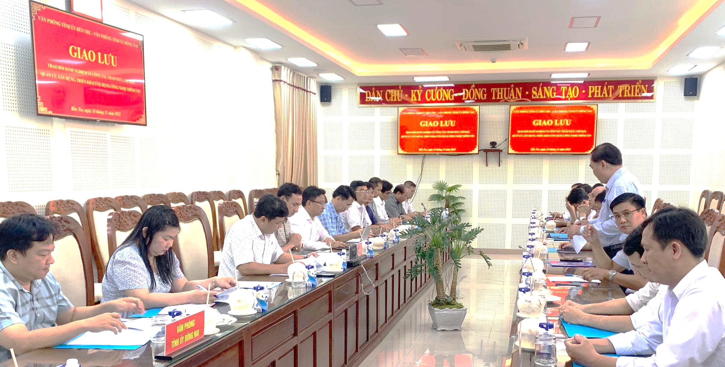 Ngày 24/11/2023, đoàn công tác của Văn phòng Tỉnh ủy Đồng Nai do đồng chí Nguyễn Xuân Cường, Phó Chánh Văn phòng Tỉnh ủy Đồng Nai làm trưởng đoàn có buổi giao lưu trao đổi kinh nghiệm trong công tác tham mưu, chỉ đạo, quản lý, xây dựng, triển khai ứng dụng công nghệ thông tin, công tác cơ yếu tại Văn phòng Tỉnh ủy Bến Tre.