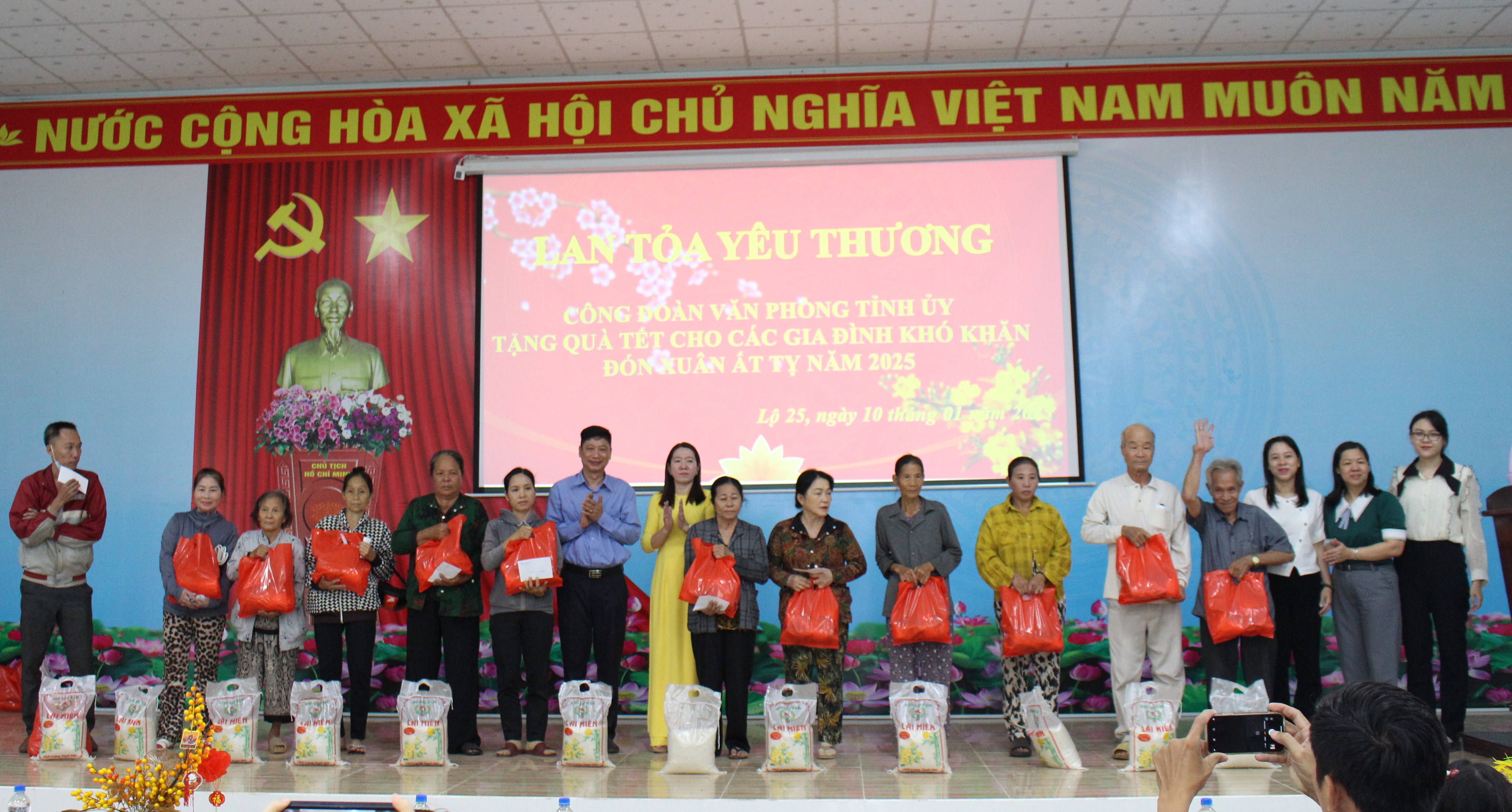Với tinh thần truyền thống “Tương thân, tương ái” và hưởng ứng cuộc vận động “Cả nước chung tay vì người nghèo không ai bị bỏ lại phía sau”, bên cạnh hoạt động chăm lo Tết cho các đoàn viên, người lao động, chung tay cùng địa phương chăm lo cho các gia đình khó khăn đón tết ấm áp, sum vầy. Sáng ngày 10/01/2025, Công đoàn cơ sở Văn phòng Tỉnh ủy do đồng chí Từ Thiên Tú, Phó Chánh Văn phòng, Chủ tịch Công đoàn cơ sở Văn phòng Tỉnh ủy làm Trưởng đoàn cùng các đồng chí trong Ban Chấp hành, đoàn viên Công đoàn Văn phòng Tỉnh ủy đã đến thăm, trao tặng quà Tết năm 2025 cho 25 hộ nghèo, hộ có hoàn cảnh khó khăn đặc biệt, mỗi phần trị giá 500 ngàn đồng (bao gồm: gạo, dầu ăn, đường, muối và tiền mặt). Đến dự có bà Lê Thị Kim Trinh - Huyện ủy viên, Bí thư Đảng ủy xã Lộ 25, huyện Thống Nhất.
