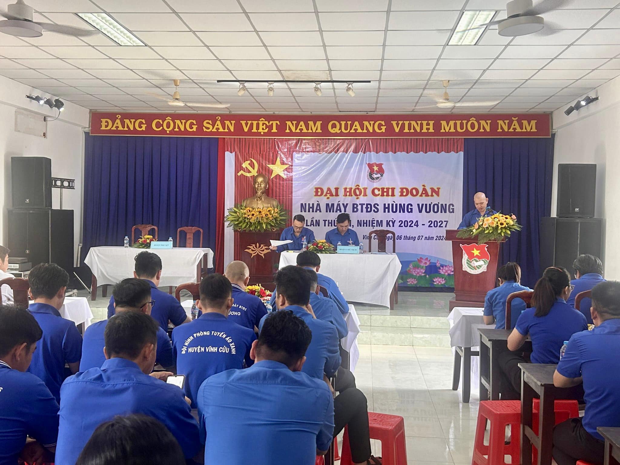 Sáng ngày 06/07/2024 tại hội trường Nhà Máy Bê tông Đúc sẵn Hùng Vương đã diễn ra Đại hội Chi đoàn Nhà Máy Bê tông Đúc sẵn Hùng Vương lần thứ VII, nhiệm kỳ 2024-2027. Đại hội vinh dự có sự góp mặt của các đồng chí lãnh đạo và đại biểu khách mời. Về phía Huyện đoàn: đồng chí Đàm Quốc Đạc - Huyện ủy viên - Bí thư Huyện Đoàn. Về phía Đảng bộ Nhà máy Bê tông Đúc sẳn Hùng Vương: đồng chí Đào Văn Hạc - Phó Bí thư Đảng ủy - TGĐ Công ty XDCT Hùng Vương. Các đơn vị khách mời có đoàn xã Thạnh Phú, đoàn công ty TNHH Changshin Việt Nam và đặc biệt là sự có mặt của 51 đoàn viên Chi đoàn.