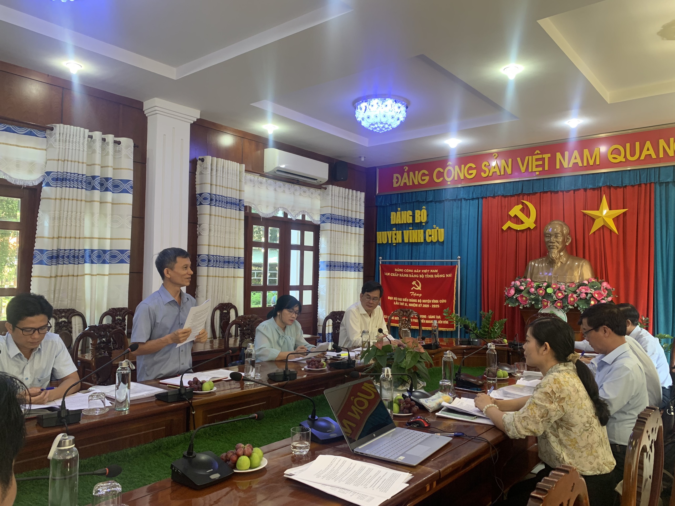 Đồng chí Lê Ngọc Hiếu - Huyện ủy viên, Phó Chủ nhiệm Ủy ban Kiểm tra Huyện ủy trình bày báo cáo tại buổi làm việc