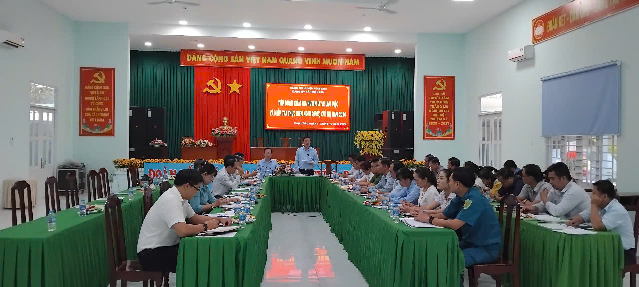 Chiều ngày 11/12/2024, Đoàn kiểm tra số 1 của Ban Thường vụ Huyện ủy do đồng chí Lê Thành Mỹ - Tỉnh ủy viên, Bí thư Huyện ủy làm trưởng đoàn đã có buổi làm việc với Đảng ủy xã Thiện Tân về kết quả thực hiện nghị quyết, chỉ thị của Đảng năm 2024. Cùng dự có đồng chí Lê Nguyễn Song Toàn – UVTV – PCT UBND huyện, đồng chí Thái Tam Sơn – UVTV – trưởng Ban Dân vận Huyện ủy, đồng chí Lê Văn Hoàng – UVTV – Trưởng Ban Tổ chức Huyện ủy, cùng các thành viên là trưởng, phó các phòng Ban của Huyện. Dự và tiếp đoàn kiểm tra có đồng chí Phạm Hồng Thanh - Bí thư Đảng ủy, Chủ tịch Hội đồng nhân dân xã; đồng chí Huỳnh Văn Thiệt – Phó Bí Thư, Chủ tịch UBND xã và các đồng chí trong Ban Chấp hành Đảng ủy xã, trưởng các đoàn thể chính trị, Bí thư các chi bộ trực thuộc.