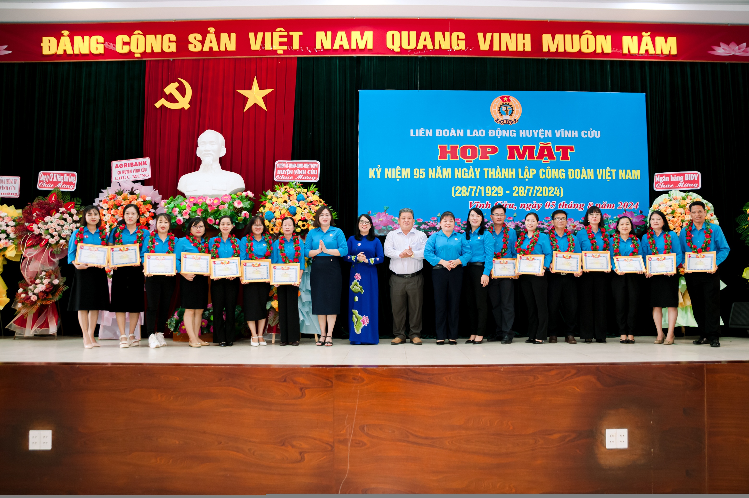 Sáng ngày 05/8, Liên đoàn Lao động huyện Vĩnh Cửu tổ chức họp mặt nhân kỷ niệm 95 năm Ngày thành lập Công đoàn Việt Nam (28/7/1929 - 28/7/2024). Tham dự buổi họp mặt có đồng chí Nguyễn Thị Như Ý – Tỉnh ủy viên- Chủ tịch Liên đoàn Lao động tỉnh Đồng Nai; đồng chí Nguyễn Văn Thuộc – Tỉnh ủy viên – Bí thư Huyện ủy; các đồng chí Ủy viên Ban Thường vụ LĐLĐ tỉnh; Ủy viên Ban Thường vụ Huyện ủy; đại diện các cơ quan, ban ngành đoàn thể huyện; các đồng chí là lãnh đạo LĐLĐ huyện qua các thời kỳ; các đồng chí Ủy viên Ban Thường vụ, Ủy viên Ban chấp hành Liên đoàn Lao động huyện; đại diện Ban chấp hành các Công đoàn cơ sở.